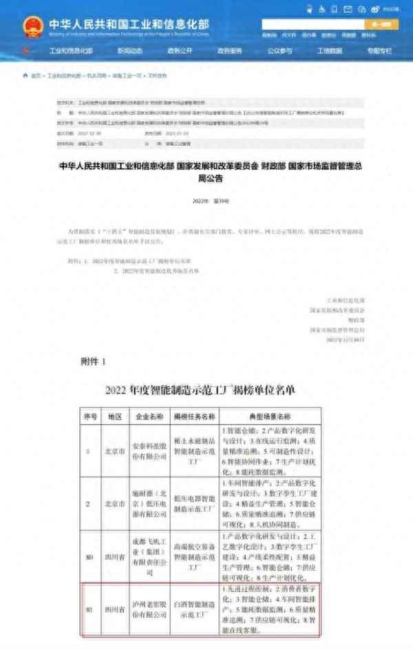 近日,工信部、国家发改委、财政部、国家市场监管总局联合发布公告(2022年第39号),公布了2022年度智能制造示范工厂揭榜单位和优秀场景名单。经省级有关部门推荐、专家评审、网上公示等程序,泸州老窖股份有限公司申报的“白酒智能制造示范工厂”入选2022年度智能制造示范工厂揭榜名单,成为白酒行业首...